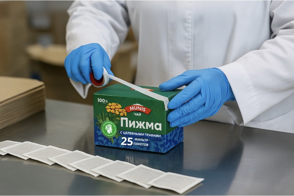 Высушенные травы бережно измельчаются и фасуются в квадратные фильтр-пакеты. Затем готовый чай упаковывается в фирменные коробки Munis с соблюдением всех стандартов качества и гигиены.